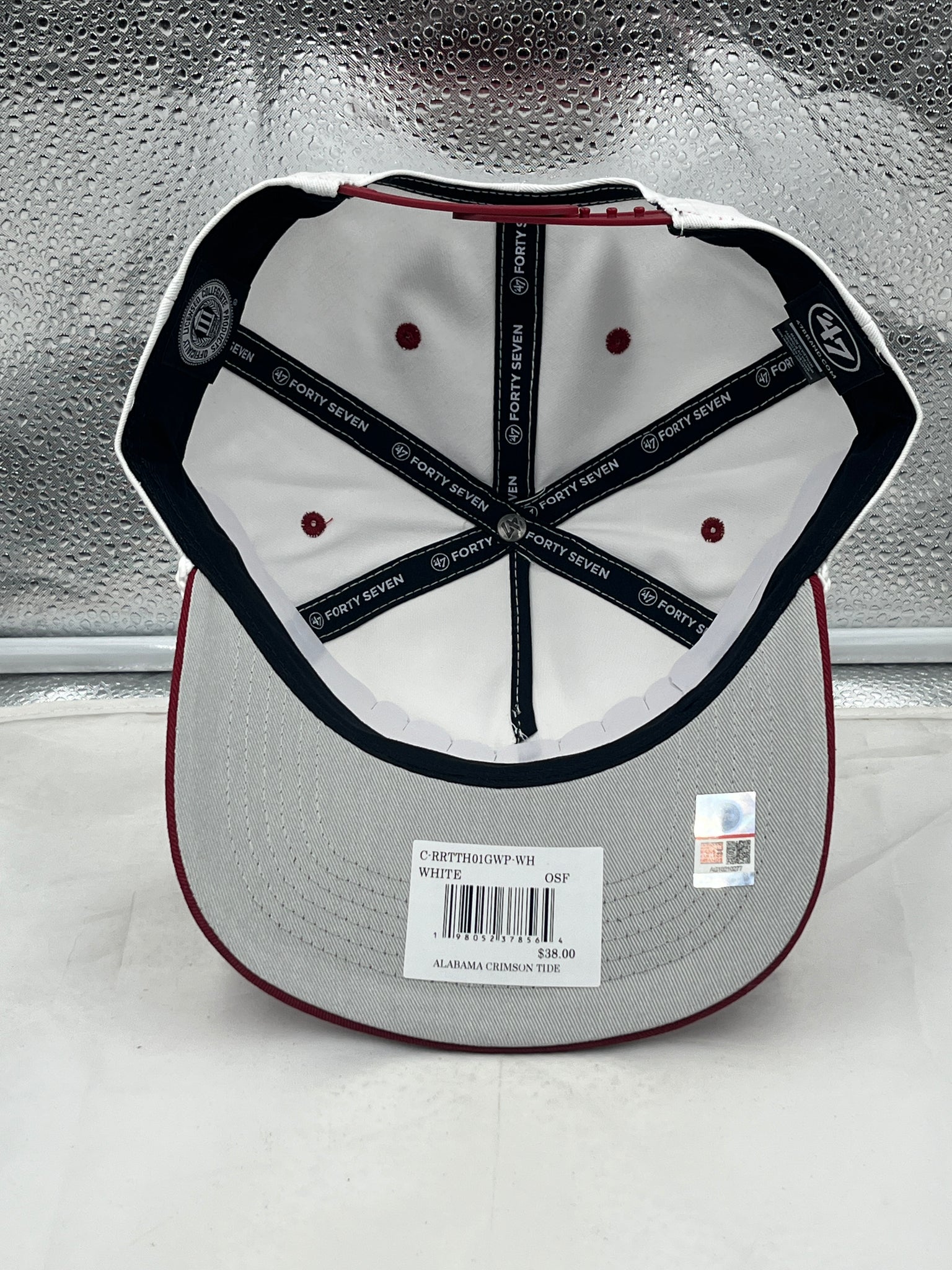 Alabama Crimson Tide NCAA '47 Brand White TT Hitch Rope Adjustable Snapback Hat displayed from a front view showing the iconic logo and stylish design.