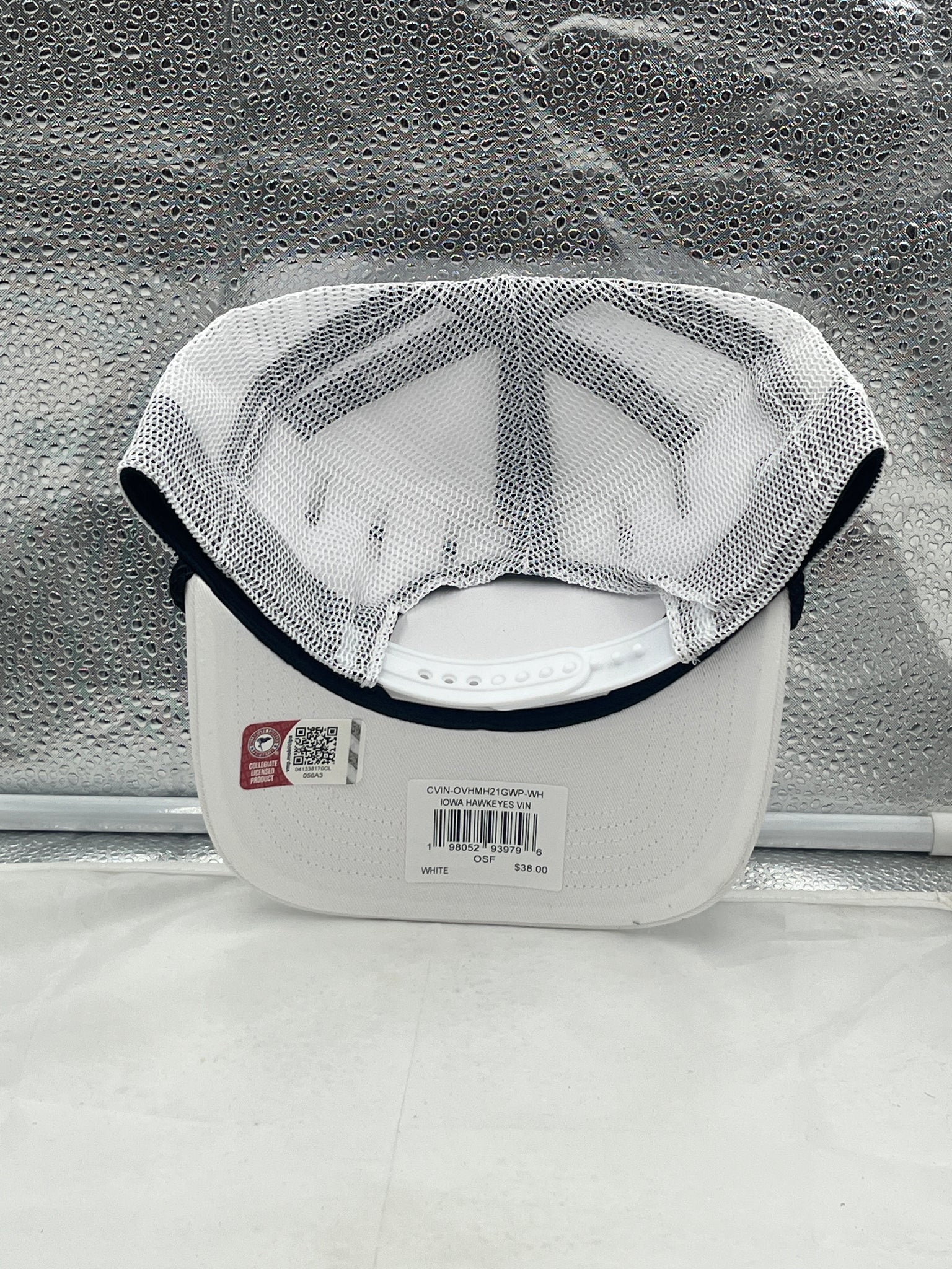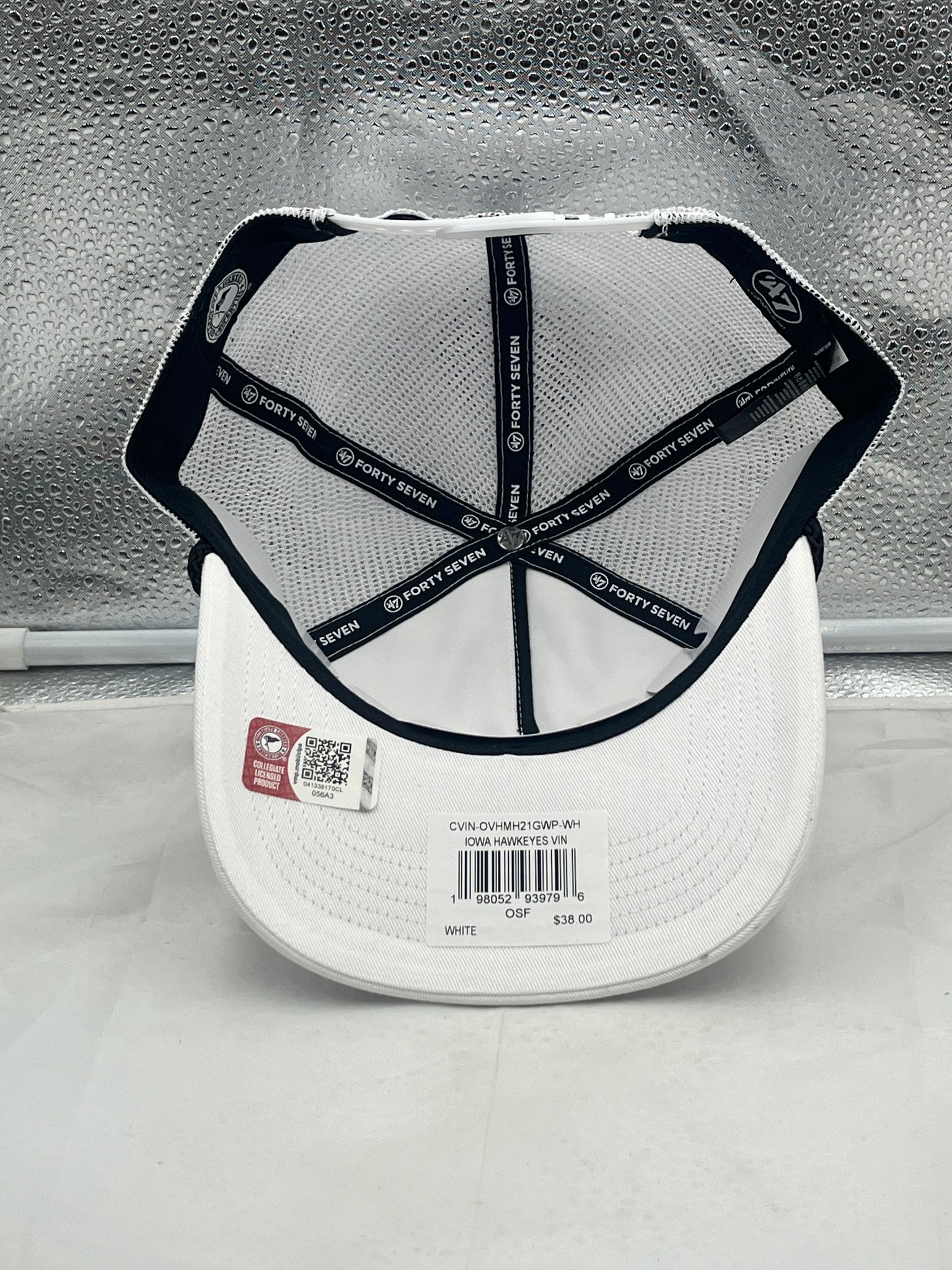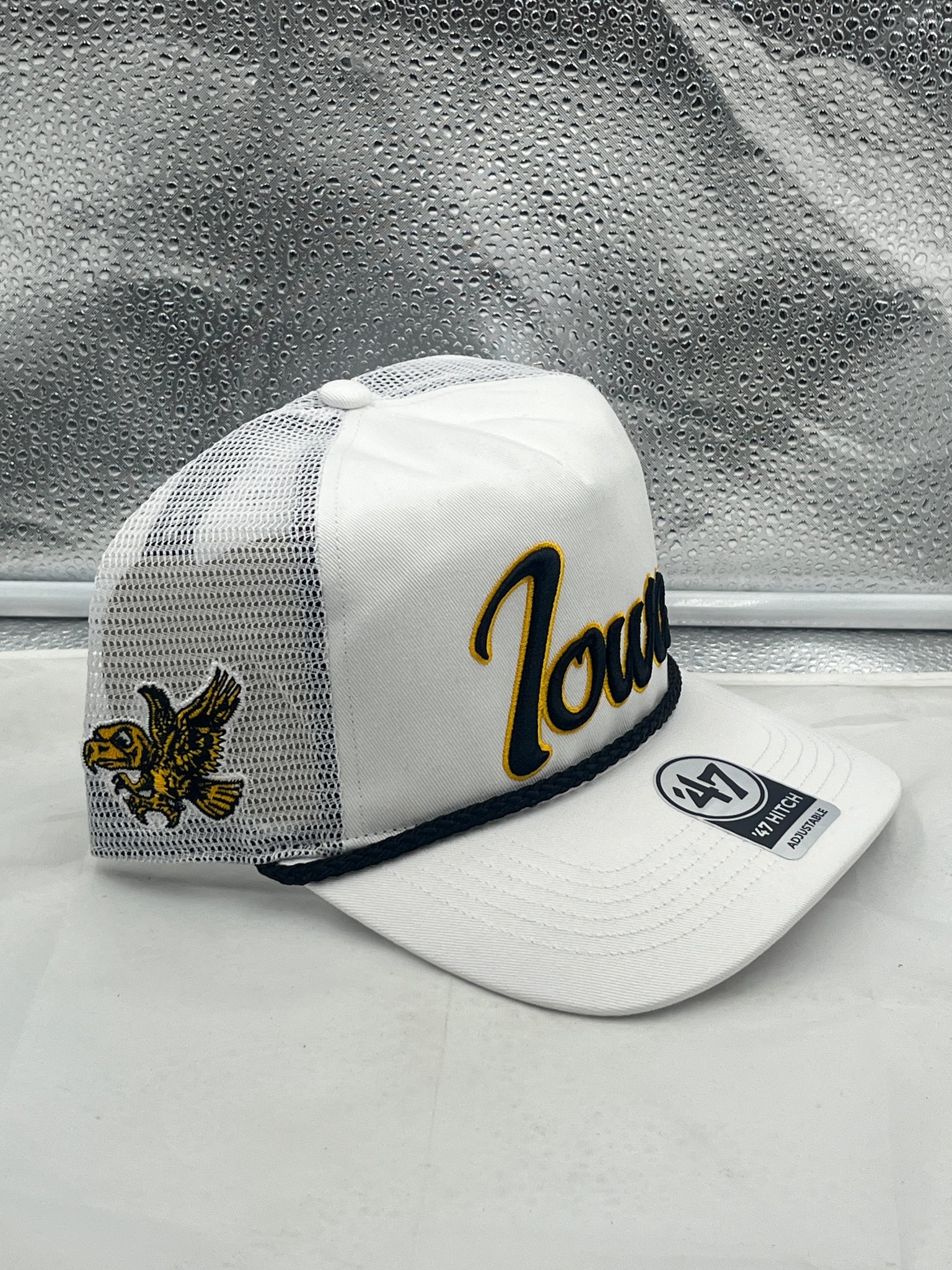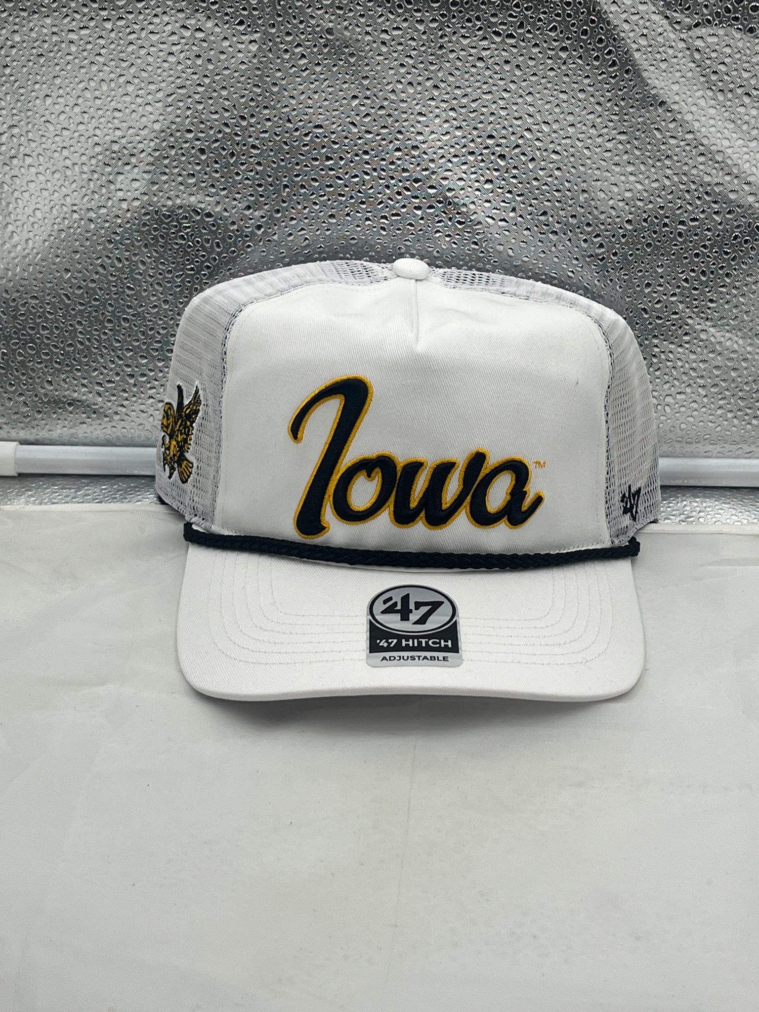 Iowa Hawkeyes NCAA 47 Brand White Script Rope Hitch Mesh Adjustable Snapback Hat displayed on a table, perfect for game day or tailgate parties.