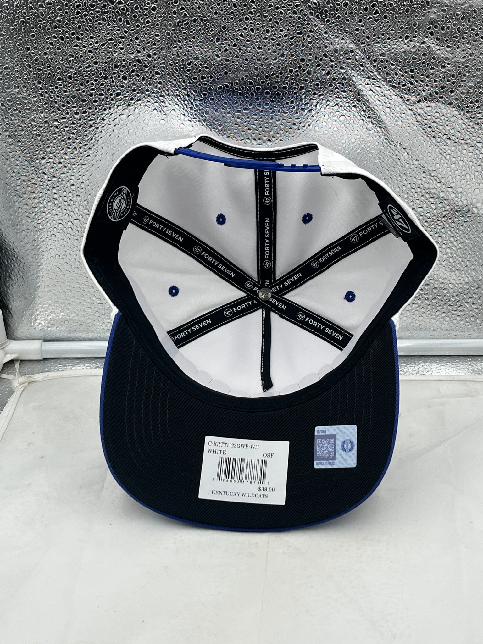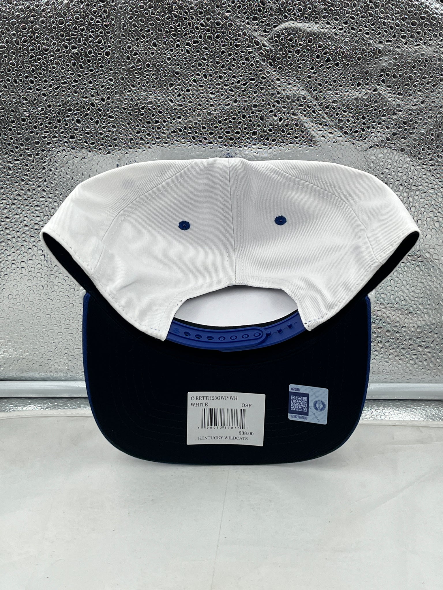 Back view of the Kentucky Wildcats NCAA '47 Brand White TT Hitch Rope Adjustable Snapback Hat featuring the adjustable snapback closure, ensuring a perfect fit and comfort for loyal Kentucky Wildcats hat fans.