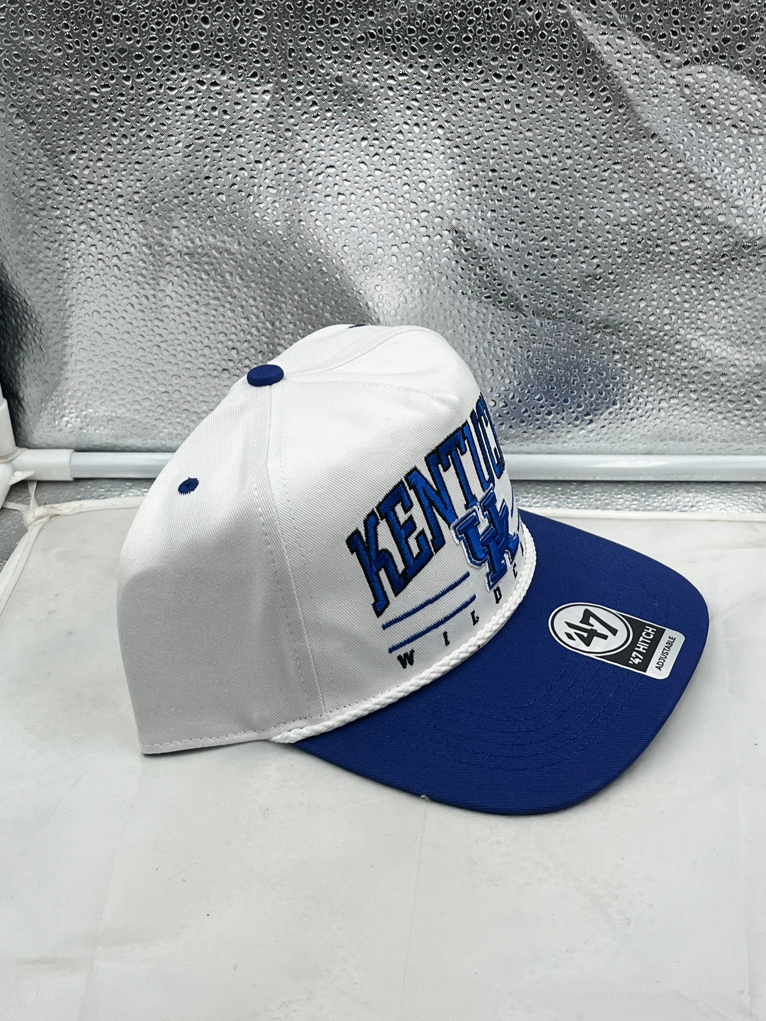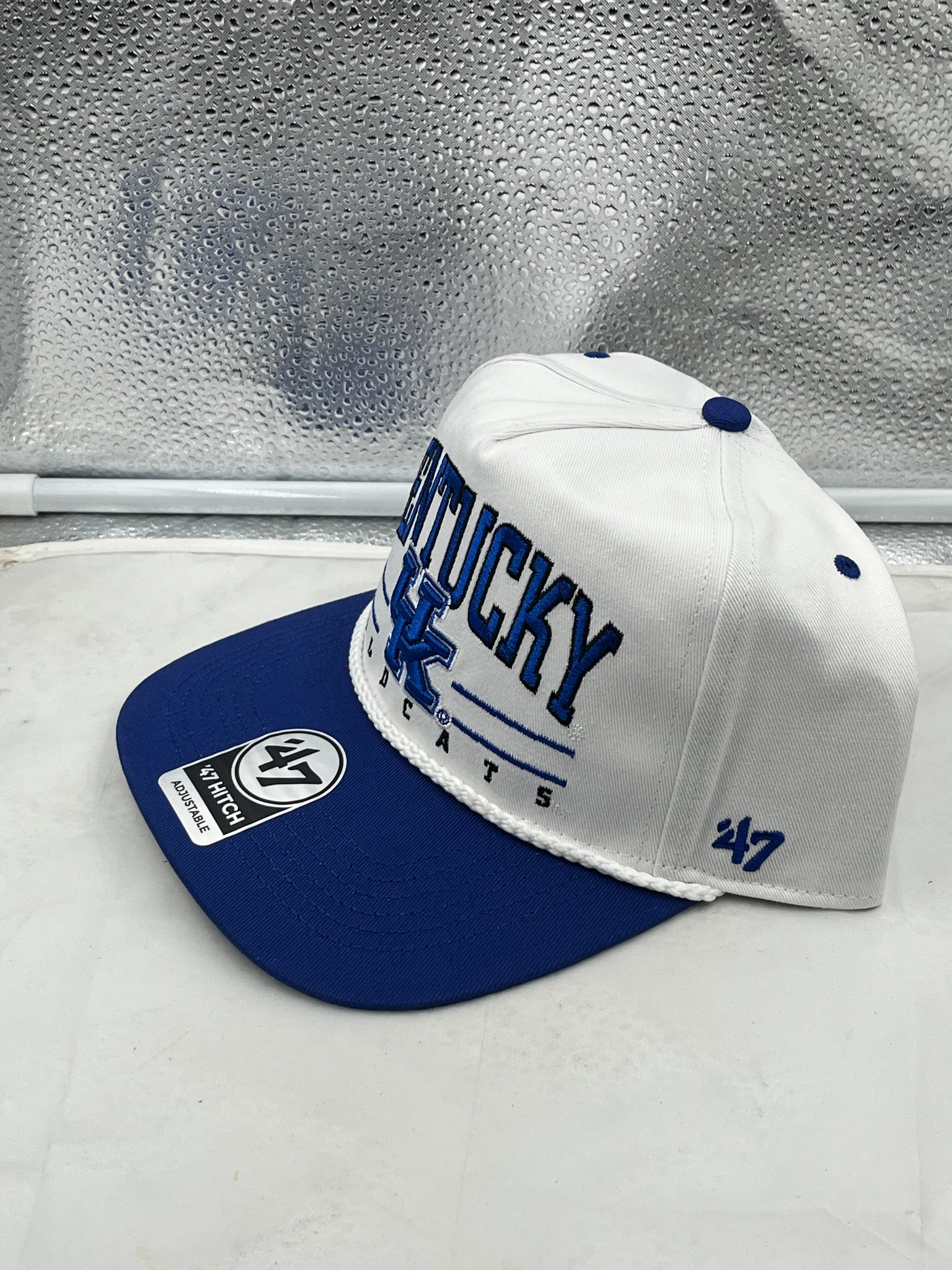 Kentucky Wildcats NCAA '47 Brand White TT Hitch Rope Adjustable Snapback Hat displayed on a white background, emphasizing the stylish design and unique hitch rope detail, perfect for fans looking for a comfortable, fashionable Kentucky Wildcats hat.
