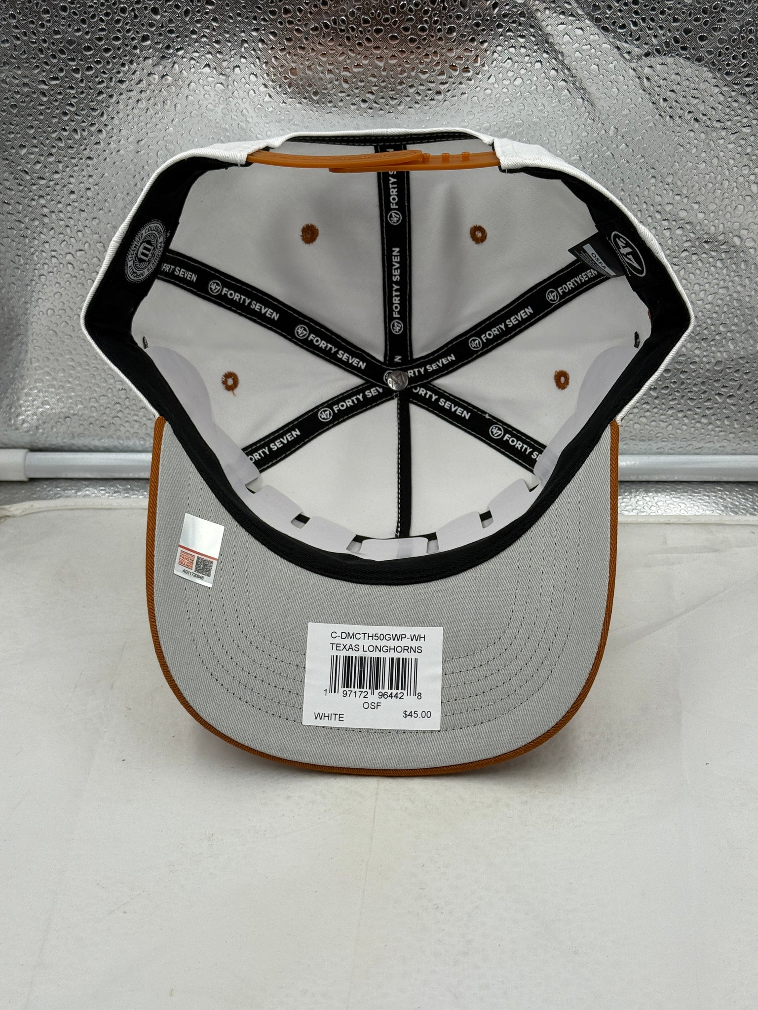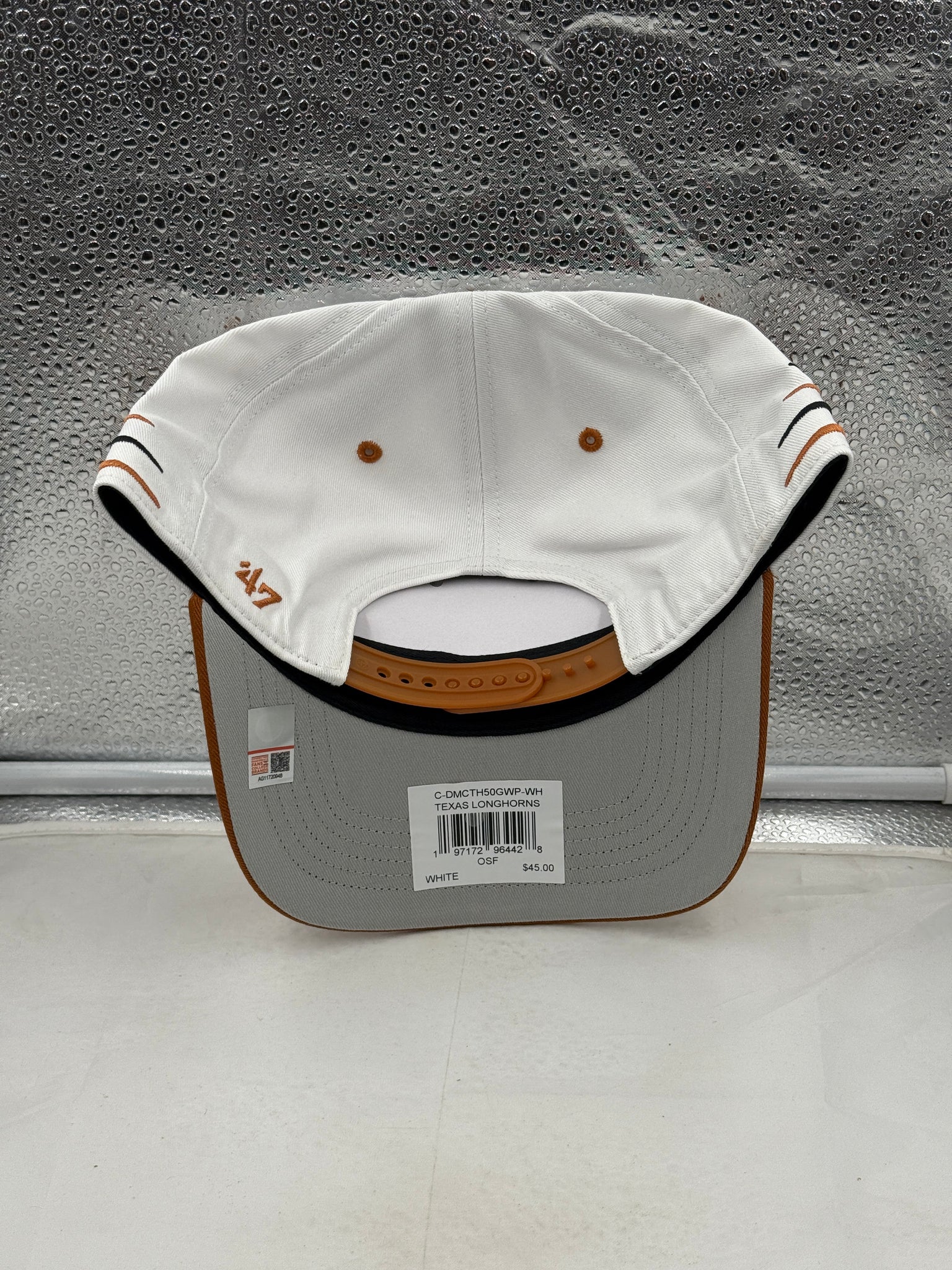 Close-up view of the Texas Longhorns NCAA '47 Brand White Diamond Hitch Snapback Adjustable Hat showing the adjustable snapback closure and comfortable fit.
