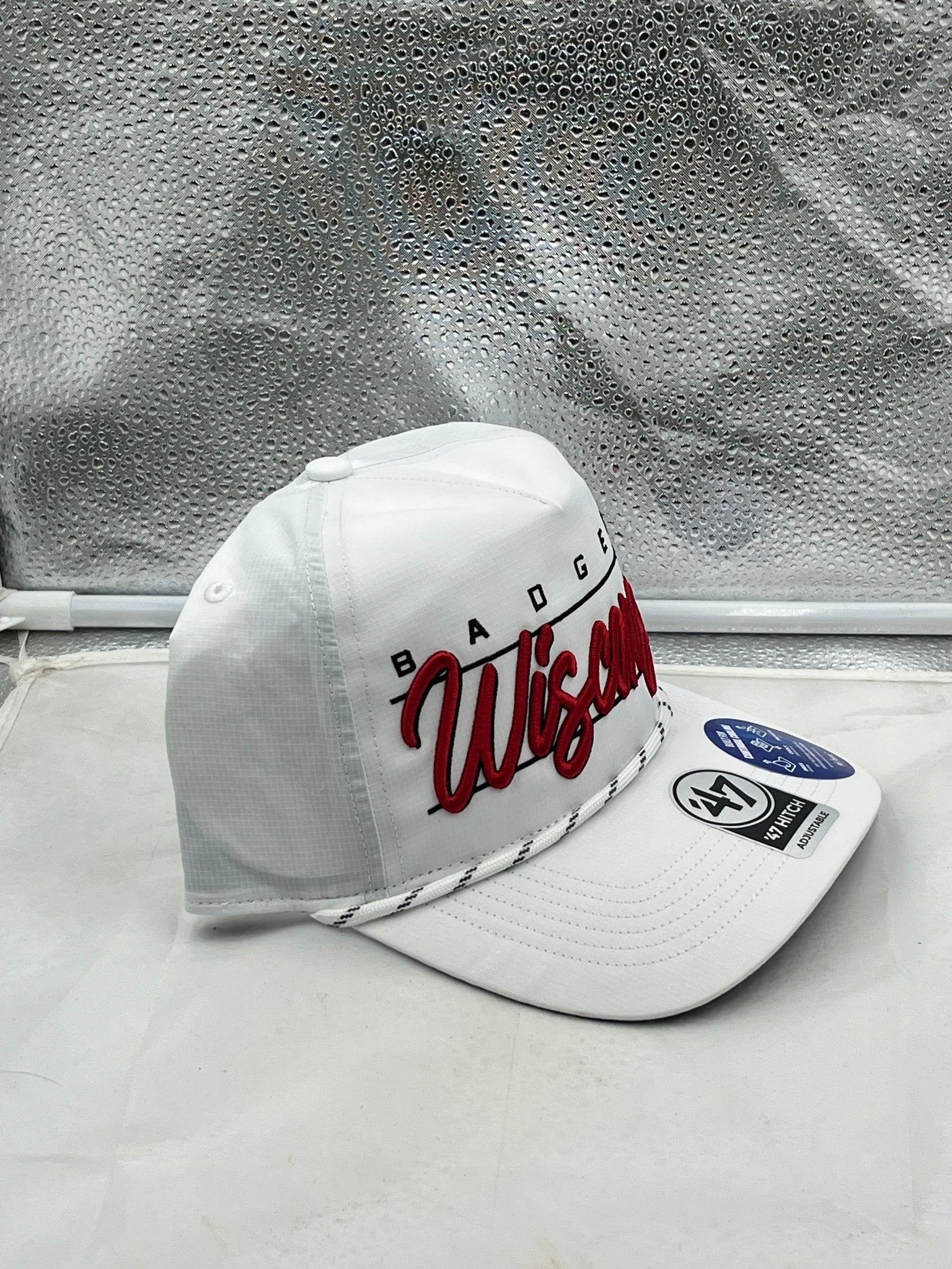 Wisconsin Badgers NCAA '47 Brand White Hitch Script Rope Adjustable Snapback Hat featuring a bold Badgers script logo and vintage rope design.