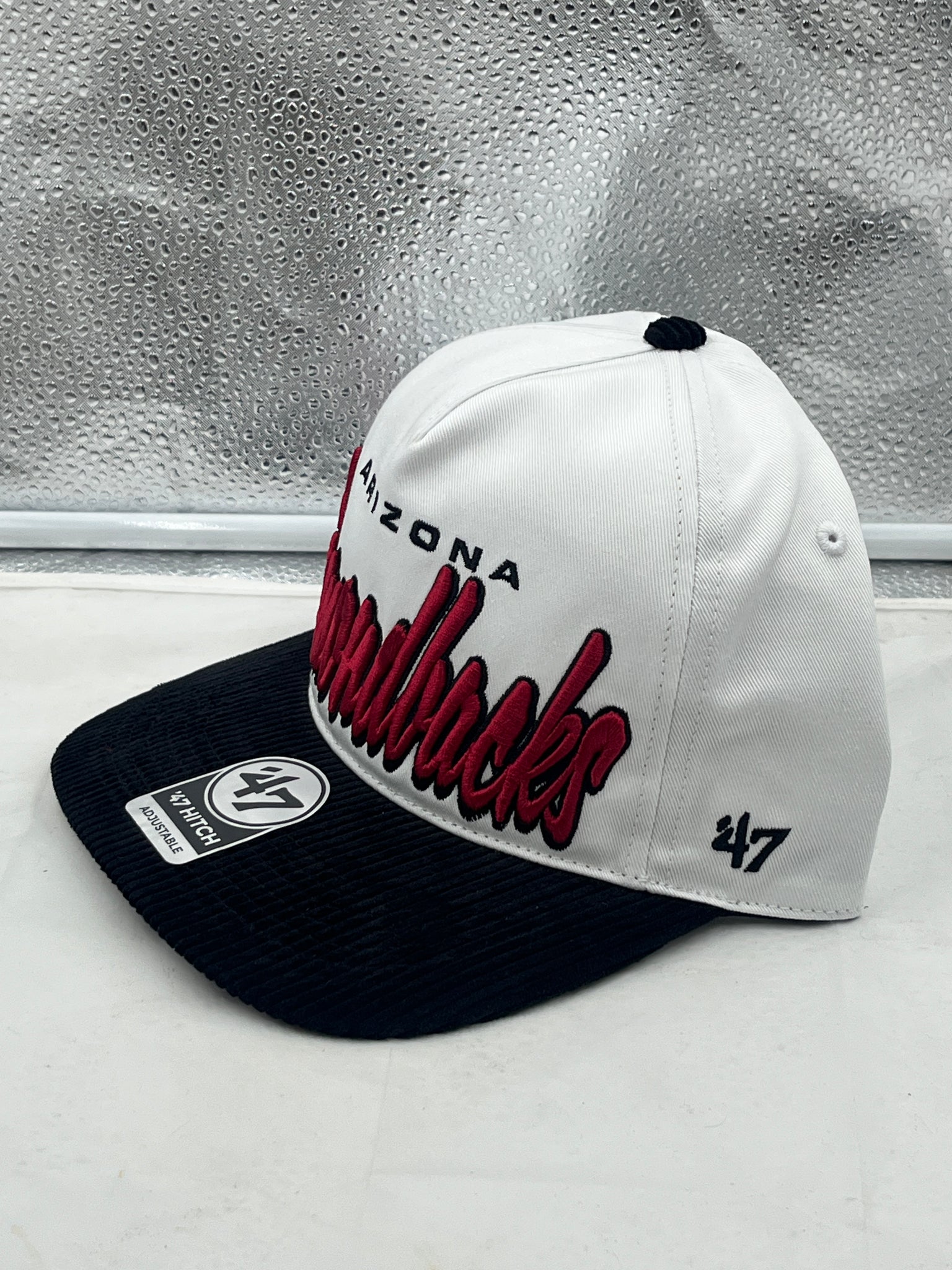 Arizona Diamondbacks MLB '47 White Two Tone Script Hitch Adjustable Snapback Hat displayed sideways highlighting the snapback closure.