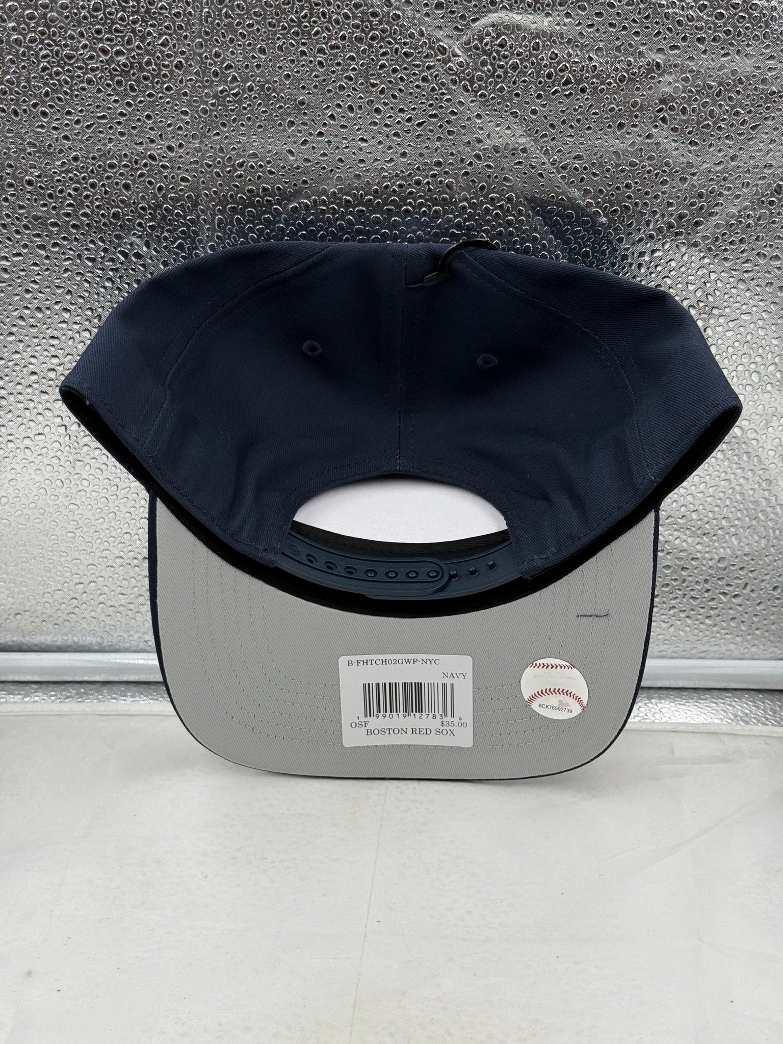 Back view of the Boston Red Sox MLB '47 Brand Navy Script Hitch Adjustable Snapback Hat highlighting the adjustable feature, making it a versatile Boston Red Sox hat for any fan.