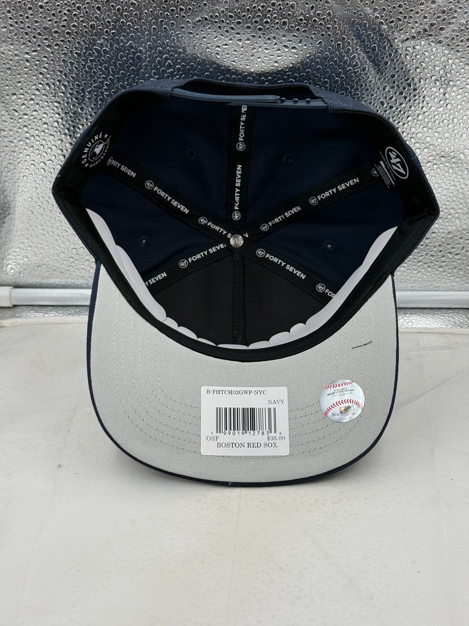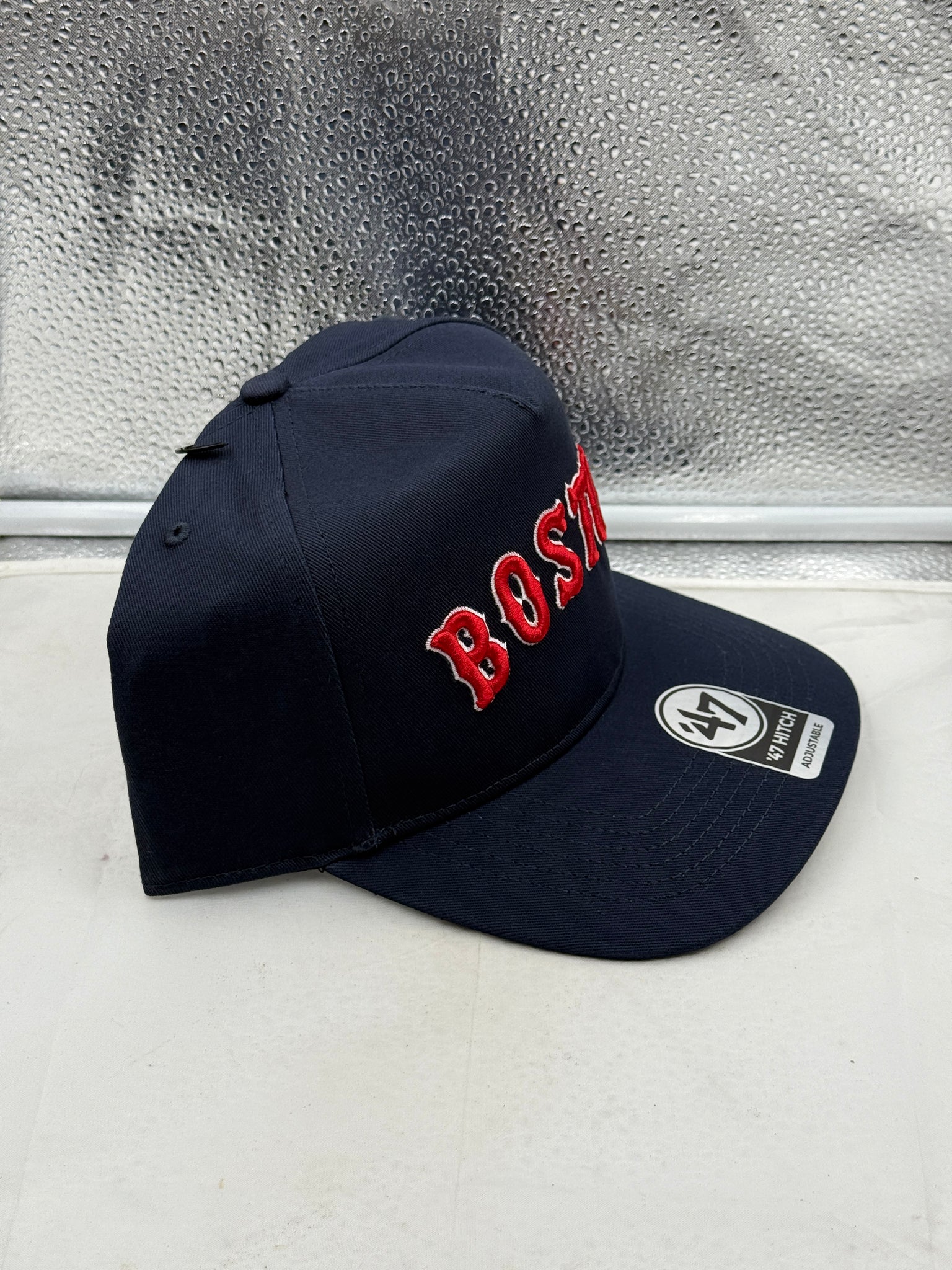 Close-up view of the Boston Red Sox MLB '47 Brand Navy Script Hitch Adjustable Snapback Hat showcasing the detailed script logo, ideal for Boston Red Sox hat enthusiasts.