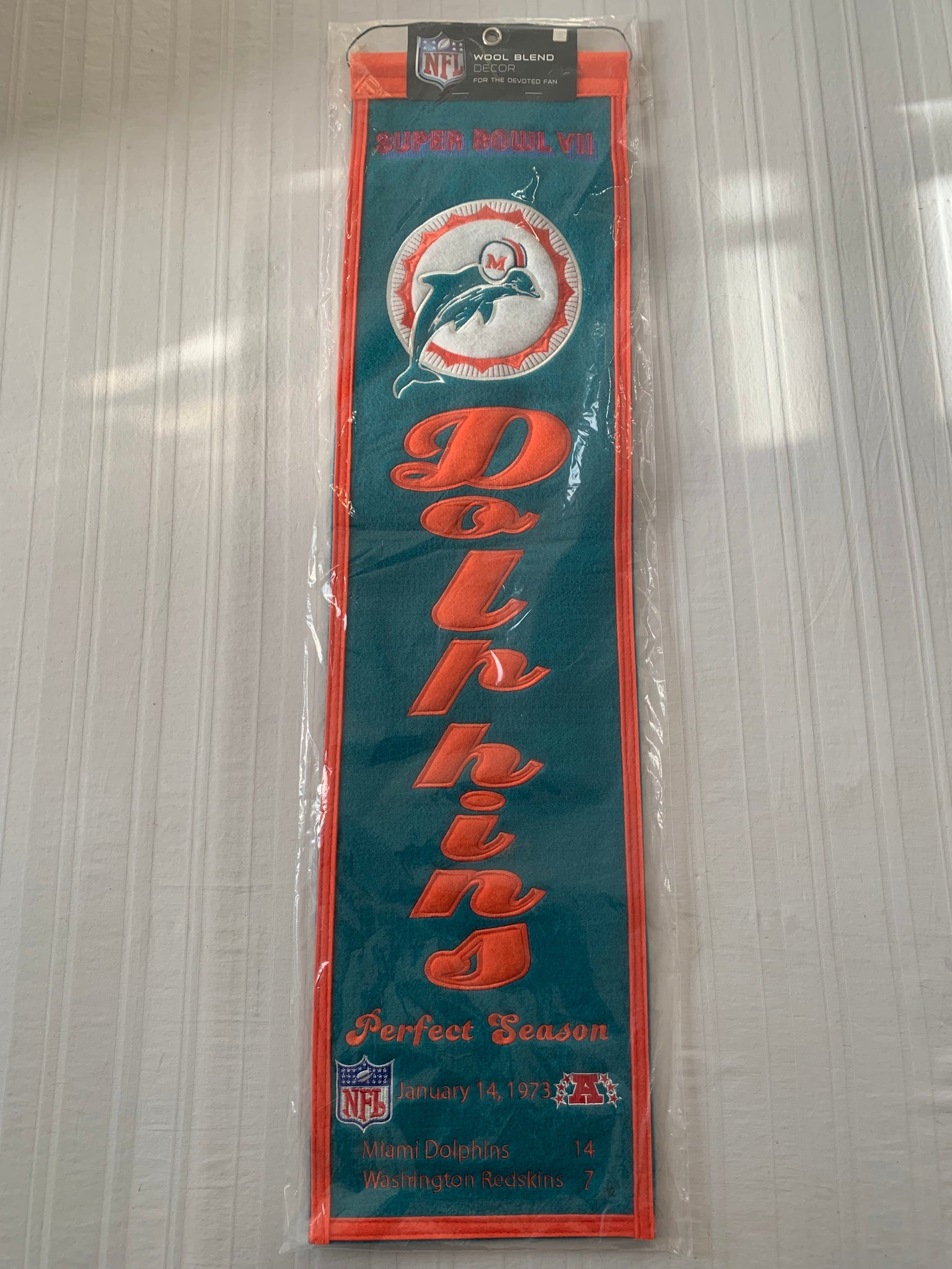 This Miami Dolphins NFL Super Bowl VII Heritage Banner is a must-have for any true fan. Its bold design and rich history make it a perfect statement piece for game day gatherings or everyday enjoyment. Show off your allegiance to the team while adding a touch of professional sports decor to your space. Get yours today and celebrate the legacy of the Miami Dolphins!