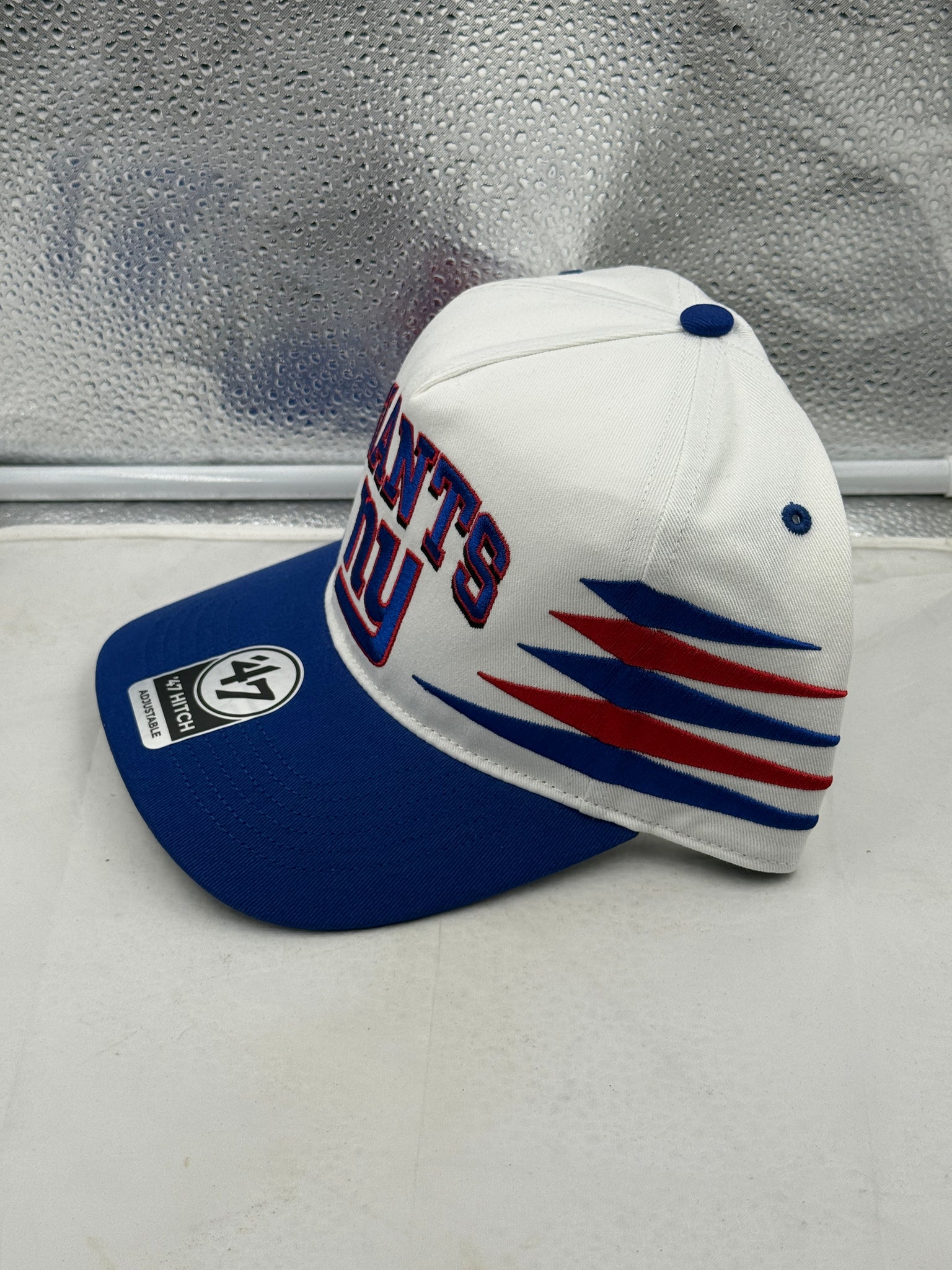 New York Giants NFL '47 Brand White TT Diamond Hitch Snapback Adjustable Hat shown at an angle, highlighting the adjustable snapback closure and high-quality fabric for durability.