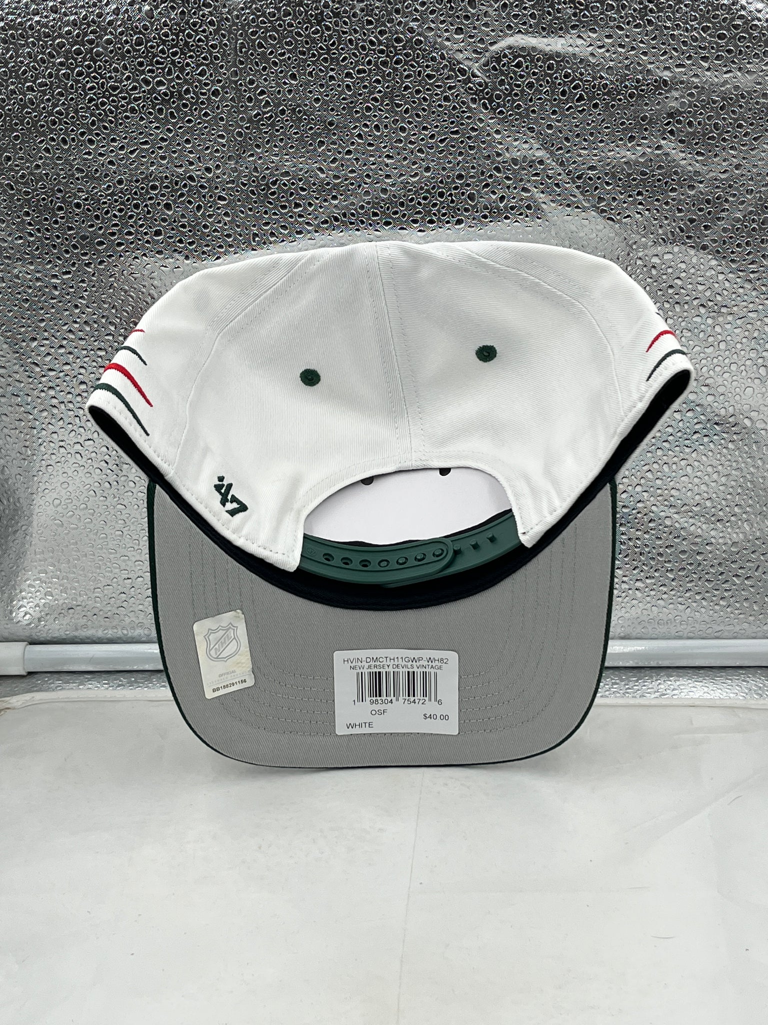 • Load image into Gallery viewer, New Jersey Devils NHL '47 Brand White Diamond Hitch Adjustable Snapback Hat showcasing its sleek design and adjustable fit, perfect for fans of the team.