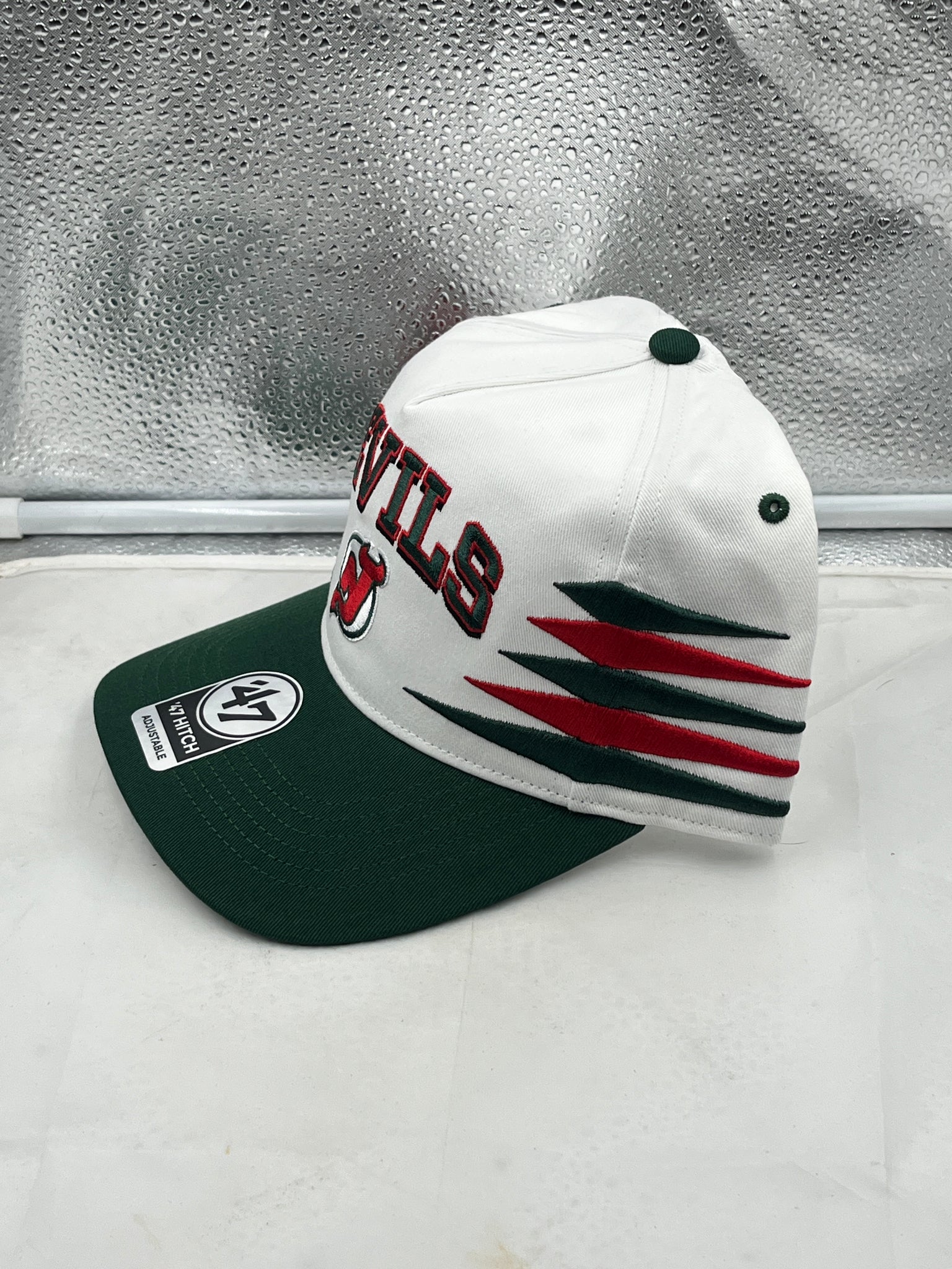 New Jersey Devils NHL '47 Brand White Diamond Hitch Adjustable Snapback Hat showcasing its sleek design and adjustable fit, perfect for fans of the team.